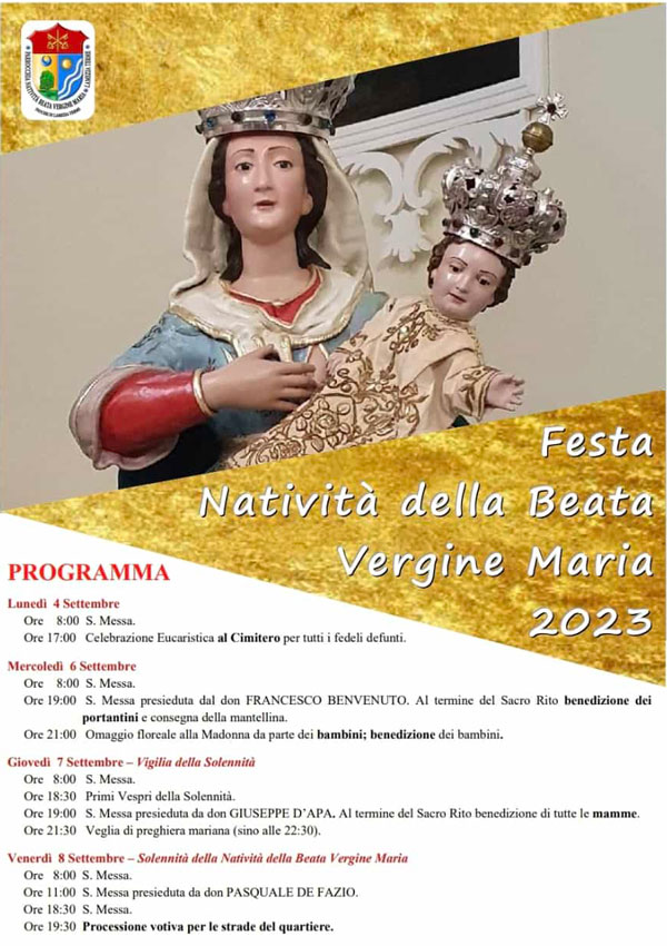 Iniziata il 30 agosto il novenario di preparazione alla festa Patronale della Parrocchia Natività della Beata Vergine Maria nel quartiere Bella. Si tratta di un momento sentito da tutta la comunità che culmina con i festeggiamenti del 7 e 8 settembre. A far entrare nel vivo i festeggiamenti sarà l'appuntamento di mercoledì 6 settembre quando dopo la Santa Messa alle ore 21, ci sarà l'omaggio floreale alla Madonna da parte dei bambini con la benedizione. Il 7 sarà la vigilia della solennità durante la Santa Messa delle 19 ci sarà la benedizione di tutte le mamme presenti. La festa si terrà l'8 settembre quando ci sarà la processione votiva per le strade del quartiere che partirà alle 19.30. Nel giorno della festa le Sante Messe saranno celebrate alle 8, 11 e 18.30.